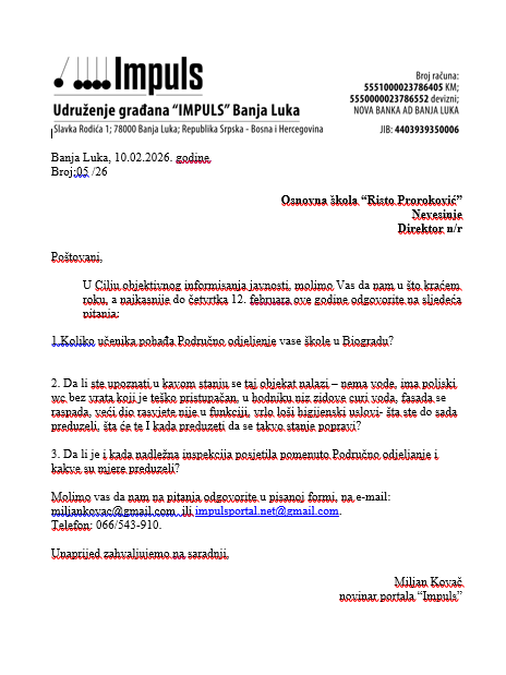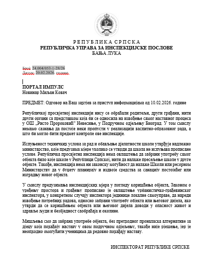 “Републичкој просвјетној инспекцији нису се обраћали родитељи, други грађани, нити други органи с представком која би се односила на извођење самог наставног процеса у ОШ „Ристо Пророковић“ Невесиње, у Подручном одјељењу Биоград. У том смислу немамо сазнања да постоје неки пропусти у реализацији васпитно-образовног рада, а што би могло бити предмет контроле ове инспекције”, наводи се, између осталог, у одговорима порталу Импулс.